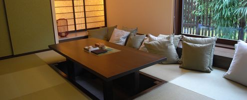 采用榻榻米席面“MIGUSA校倉-茶綠”