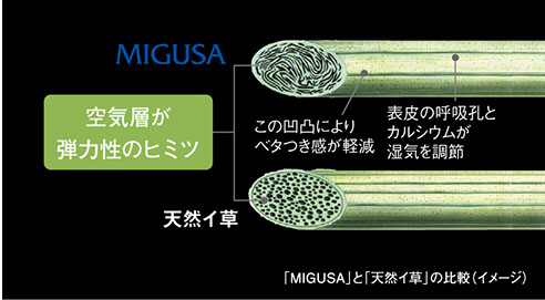 除了材料研發(fā)外,結構上還利用了燈心草的特性。莖內部形成的空氣層具有適度的緩沖性能,表面有無數(shù)微小的呼吸孔。能巧妙調節(jié)濕度,可謂是會呼吸的榻榻米。