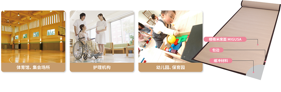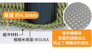 表面的MIGUSA防滑性能優(yōu)于燈芯草,榻榻米的背面采用緩沖材料,因此可保護(hù)雙腳,兒童和老年人都可以放心使用。