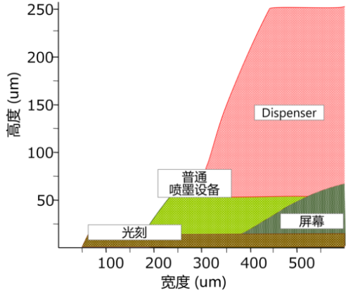 兼具微細涂布與高深寬比涂布,可以發(fā)揮“大范圍印刷”,“削減工藝”等性能優(yōu)勢,實現(xiàn)其它Dispenser方式下難以實現(xiàn)的工藝要求。