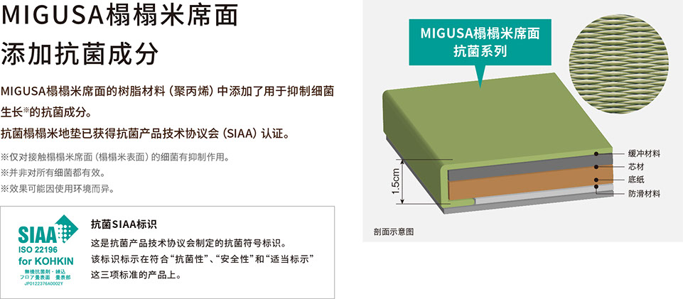 榻榻米 席面[MIGUSA]:聚丙烯、碳酸鈣 經(jīng)紗:棉-酯混紡紗