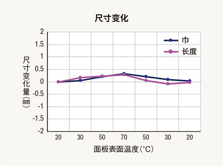 采用耐熱設(shè)計,即使長時間使用也不易翹曲和收縮,實現(xiàn)了大尺寸穩(wěn)定性。面板表面溫度改變50°C(20°C?70°C)時,尺寸變化量最大小于0.5mm,非常穩(wěn)定。