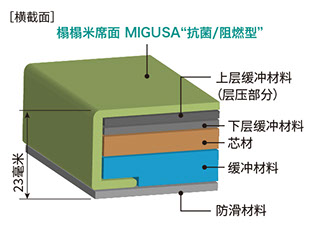 在榻榻米席面MIGUSA的樹脂材料(聚丙烯)上,賦予了抑制細(xì)菌增殖的抗菌成分和預(yù)防火災(zāi)的防火性能,是一種抗菌、防火榻榻米。
